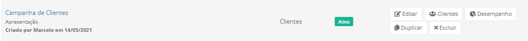 - Entre no menu Campanhas, do lado direito da tela, clique sobre o nome da campanha que deseja configurar ou clique no botão 'Editar' do lado direito da mesma;